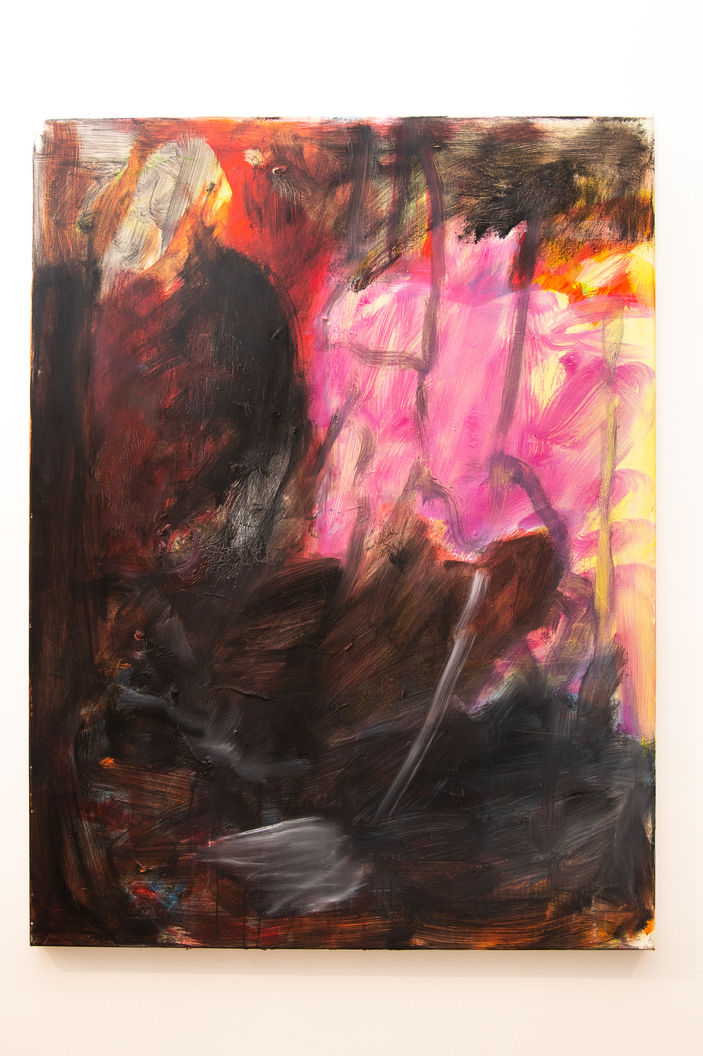 ‘Cielo’ in Spanish speaks of atmosphere, translating the English ’sky’ to a space in the air that colours it. These paintings perform a translation of words in an embodied choreography. Neither absent or present, they consider where the sky begins and ends. Acknowledging the world outside is much greater than us, the paintings remind us to look up.